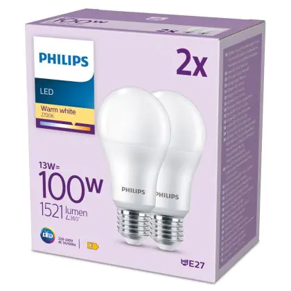 La Confezione Multipack 2x Philips Bulbo LED E27 Pera Ghiaccio 13W 1521lm - 827 Bianco Molto Caldo è la perfetta sostituzione per la tua lampada convenzionale W con attacco E27 grazie alla sua tecnologia LED. Passare a LED ti offrirà tanti vantaggi!