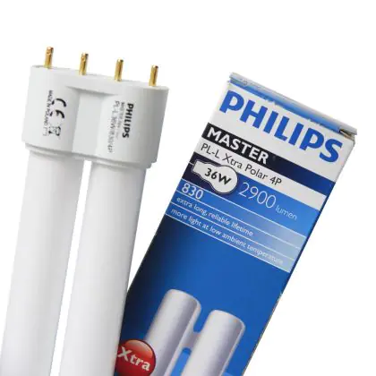 Le Philips PL-L Xtra Polar 36W 830 4P (MASTER) sono lampade fluorescenti compatte davvero efficienti, studiate e prodotte per funzionare con basse temperature. Queste lampade fluorescenti a basso consumo sono un'ottima scelta in termini di rispetto dell'ambiente in quanto hanno una lunga vita pari a 36.000 ore (praticamente doppia rispetto le corrispondenti lampade della categoria Philips PL-L Polar classica). L'attacco di queste lampade é del tipo 2G11 ed é dotato di 4 pin (perni). La potenza di tali lampade é di 36W.